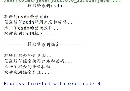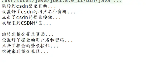ConcreteClass类是具体的实现,我们需要定义两个ConcreteClass类,Csdn、JueJin类是我们的具体实现,这两个类的具体实现跟上面的逻辑跟我们最开始设计的差不多,Csdn、JueJin类的具体实现如下: