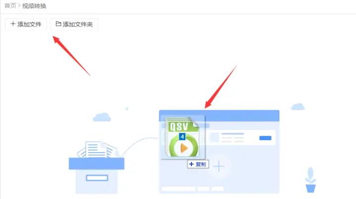 1、打开转换器选择其中的视频转换功能,并把要转换的qsv格式的视频添加到转换器中,添加时可以点击添加文件按钮,也可以把视频拖拽到转换器中。
