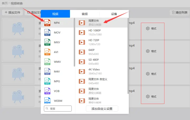 2、随后设置好输出格式,其中要把输出的视频格式设置为需要转换的mp4格式,同时也可以提高或降低视频的分辨率,或把分辨率设置为‘同原文件’分辨率。