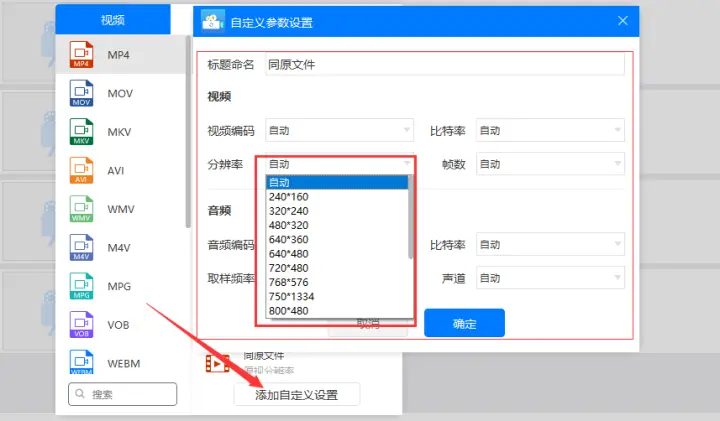 3、然后如果觉得以上默认的分辨率不能满足需求可以点击添加自定义设置按钮选择想要输出的分辨率,与此同时还可以自定义视频编码和比特率等参数。