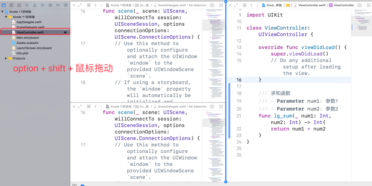 上面我们介绍了窗口分割,在 Xcode 11 中,你还可以按住 Option + Shift,然后在左边点击要打开的文件,这时会出现窗口选择提示