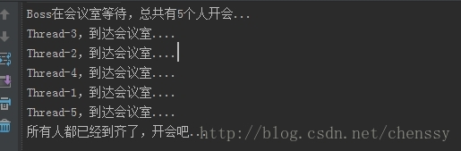System.out.println("Boss在会议室等待,总共有" + countDownLatch.getCount() + "个人开会...");