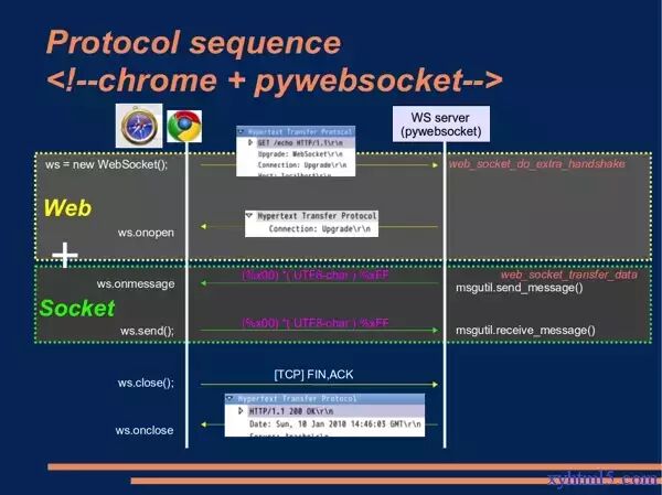 这里可以看出传统HTTP通讯与WebSocket通讯的通信流程上的区别,下图显示WebSocket主要的三步中浏览器和服务器端分别做了哪些事情。