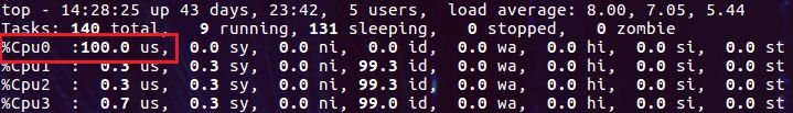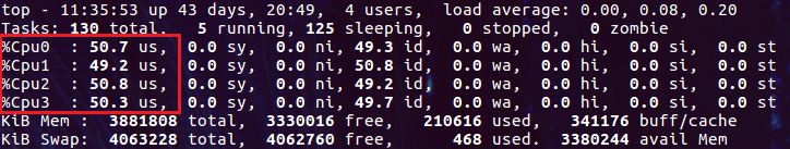 容器 CPU 的负载为 200%,它的含义为单个 CPU 负载的两倍。我们也可以把它理解为有两颗 CPU 在 100% 的为它工作。 再让我们通过 top 命令看看主机 CPU 的真实负载情况: