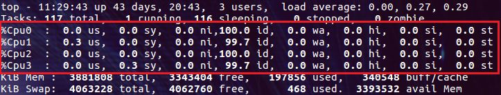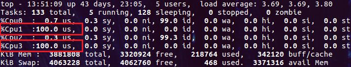 这次我们指定了 1,3 两个 CPU,运行 stress -c 4 命令,然后检查主机的 CPU 负载: