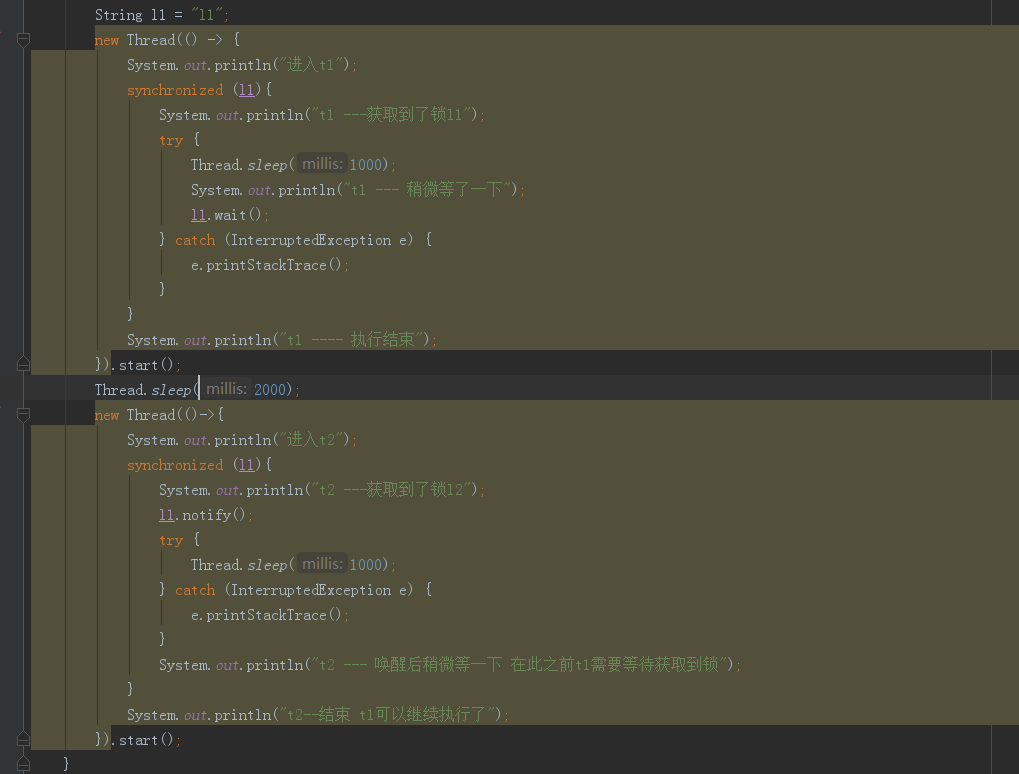 Java wait/sleep await/signal 捍卫简单 2019-09-25 342 阅读1分钟 wait/sleep wait: Object类的方法,在线程获取了对象锁后暂时释放锁,让出cpu资源,等待同一对象调用notify、notifyAll方法(notify随机唤醒一个,notifyAll全部唤醒),再次重新获取锁继续执行。 sleep:Thread类的方法,当前线程沉睡指定时间,不需要持有锁也不会释放锁。 await/signal Lock Condition提供的等待唤醒功能,可以设置等待时间