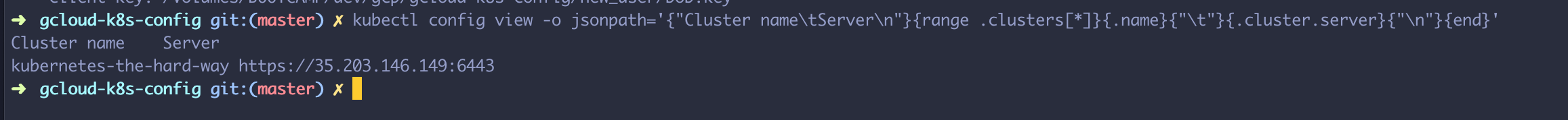 kubectl config view -o jsonpath='{"Cluster name\tServer\n"}{range .clusters[*]}{.name}{"\t"}{.cluster.server}{"\n"}{end}'