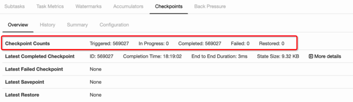 Checkpoint 是从 source 触发到下游所有节点完成的一次全局操作。下图可以有一个对 Checkpoint 的直观感受,红框里面可以看到一共触发了 569K 次 Checkpoint,然后全部都成功完成,没有 fail 的。