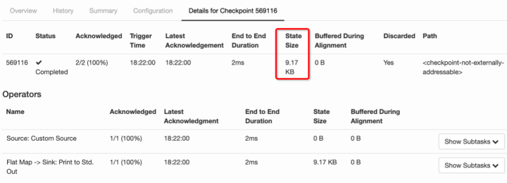 state 其实就是 Checkpoint 所做的主要持久化备份的主要数据,看下图的具体数据统计,其 state 也就 9kb 大小 。