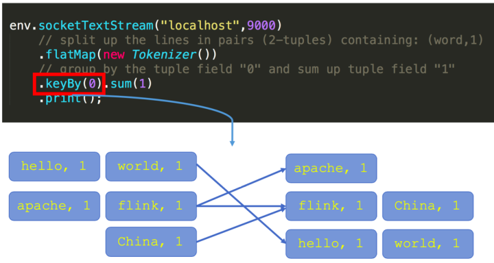 回顾一下刚才这段 word count 代码。keyby 接口的调用会创建 keyed stream 对 key 进行划分,这是使用 keyed state 的前提。在此之后,sum 方法会调用内置的 StreamGroupedReduce 实现。