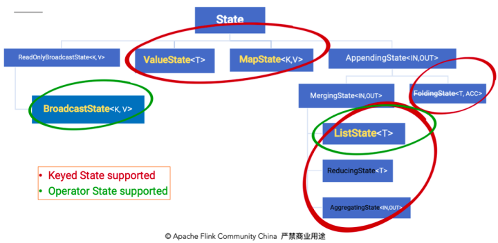 这里的fromElements会调用FromElementsFunction的类,其中就使用了类型为 list state 的 operator state。根据 state 类型做一个分类如下图: