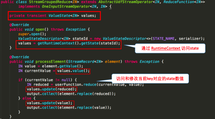 下图就前文 word count 的 sum 所使用的StreamGroupedReduce类为例讲解了如何在代码中使用 keyed state:
