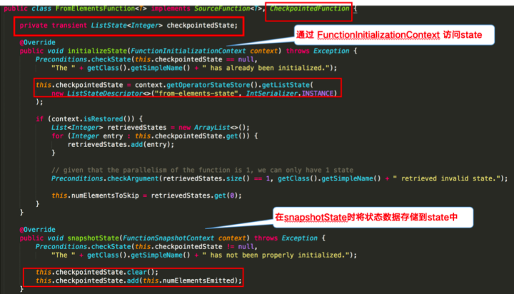 下图则对 word count 示例中的FromElementsFunction类进行详解并分享如何在代码中使用 operator state: