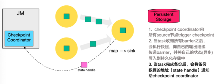 - 同样的,sink 节点在完成自己的 Checkpoint 之后,会将 state handle 返回通知 Coordinator。