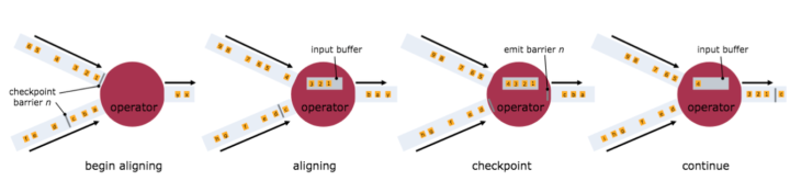 为了实现 EXACTLY ONCE 语义,Flink 通过一个 input buffer 将在对齐阶段收到的数据缓存起来,等对齐完成之后再进行处理。而对于 AT LEAST ONCE 语义,无需缓存收集到的数据,会对后续直接处理,所以导致 restore 时,数据可能会被多次处理。下图是官网文档里面就 Checkpoint align 的示意图: