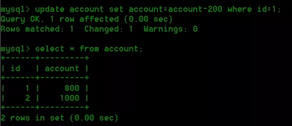 我们将 id=1 的用户 account 减 200。然后查询,发现 id=1 的用户 account 变为 800。