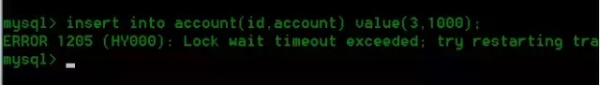 我们发现用户 A 所在的会话陷入等待,如果超时(这个时间可以进行配置),会出现 Lock wait time out 提示: