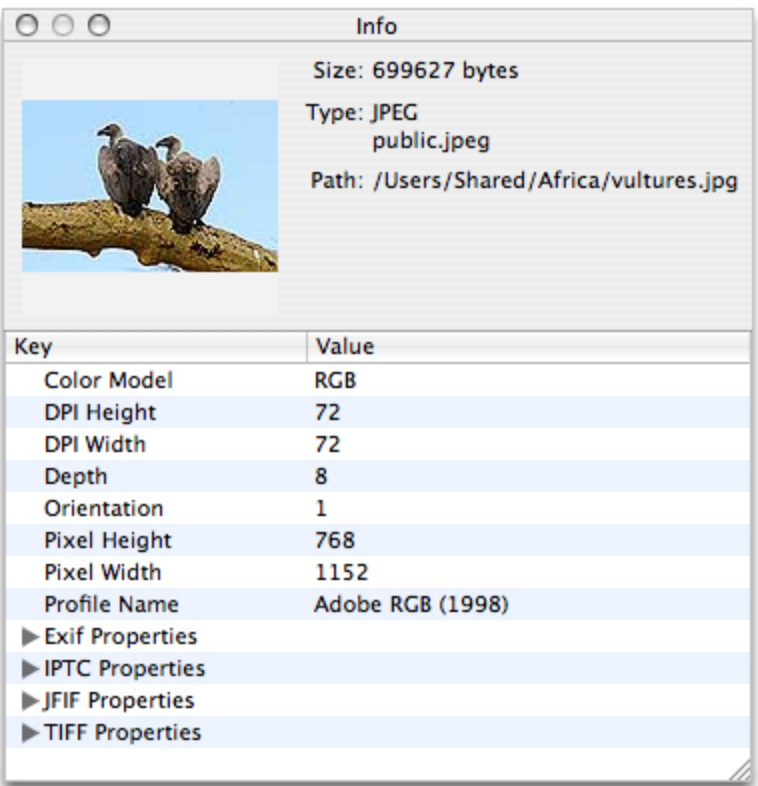 数码照片富有丰富的图像信息--图像尺寸, 分辨率, 方向, 颜色轮廓, 孔径, 测量模式, 焦距, 创建时间, 关键字, 标题等. 这些信息对于处理和编辑图片是非常有用的, 但只有在数据在用户界面中公开时. 尽管CGImageSourceCopyPropertiesAtIndex函数可以提取所有该图片相关的属性, 但你需要编写代码来遍历字典来提取并显示这些信息.