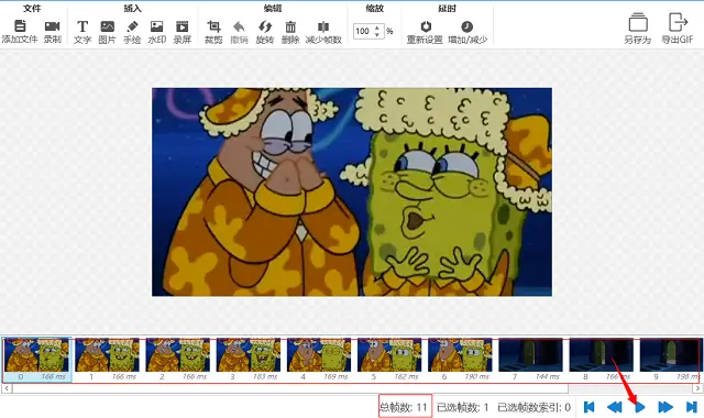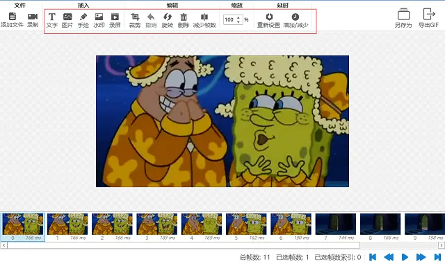 5、预览过后如果对GIF动图不满意的话还可以进行一些编辑操作,在页面的上方有很多编辑GIF的小工具,有插入图片、文字的工具、有裁剪、减少帧数的工具、也有缩放、延时的工具等等。
