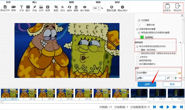 6、GIF编辑完成后想要保存的话可以点击右上角的“导出GIF”或者“另存为”按钮,然后就可以选择文件保存的路径。选择完成后点击“应用”,GIF就保存完毕了。