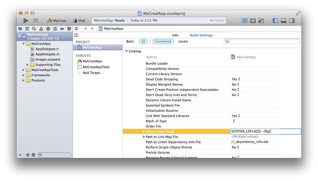 - Set the value of the Other Linker Flags build setting to $(OTHER_LDFLAGS) -ObjC.