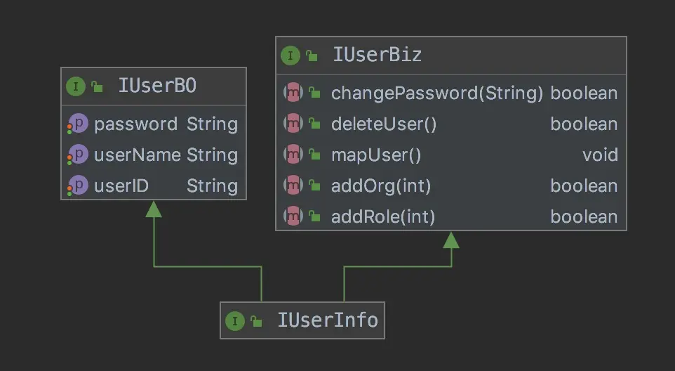 我们将IUserInfo拆分为了IUserBo和IUserBiz。我们就实现了两个类的单一职责,也就是让引起他们变化原因只有一种,并且让相关性强的内容聚合在一个类内部。