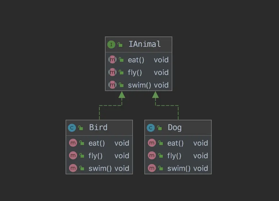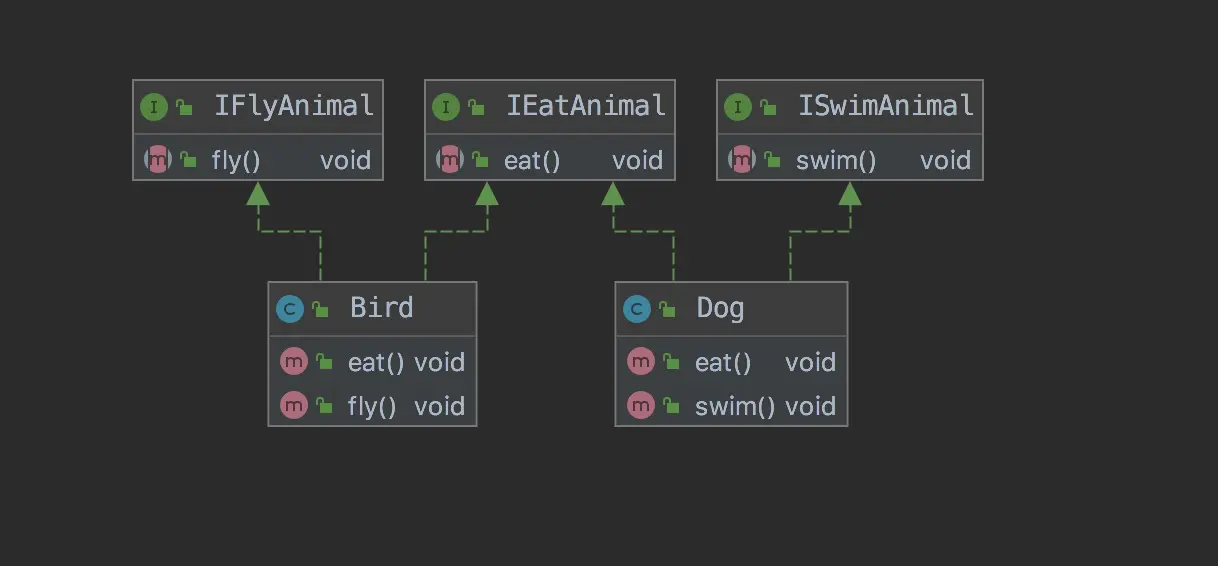 可以看出,Bird 的 swim()方法可能只能空着,Dog 的 fly()方法显然不可能的。这时候,我们针对不同动物行为来设计不同的接口,分别设计 IEatAnimal,IFlyAnimal 和 ISwimAnimal 接口,来看代码: