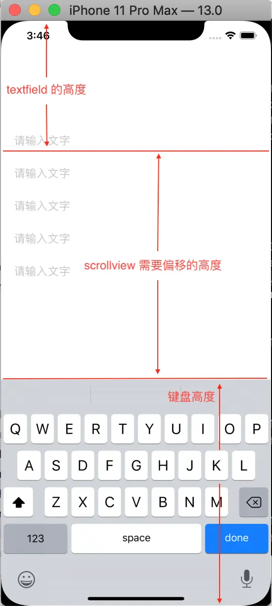 为了使输入框能够上下滑动,这里将所有 UITextField 放在一个 scrollview 上,然后添加键盘监听事件,当用户点击输入框时,触发键盘弹起,此时调整scrollView 的 contentOffset,使输入框正好位于键盘上方。