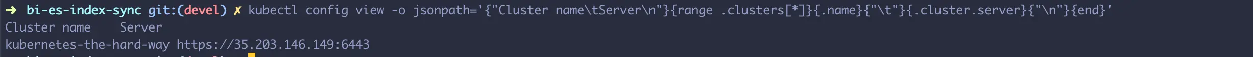 kubectl config view -o jsonpath='{"Cluster name\tServer\n"}{range .clusters[*]}{.name}{"\t"}{.cluster.server}{"\n"}{end}'