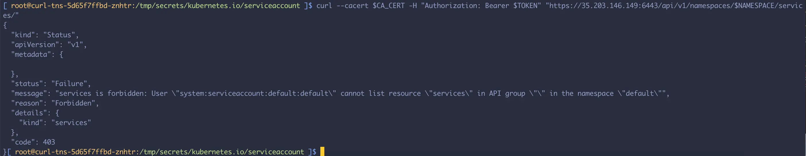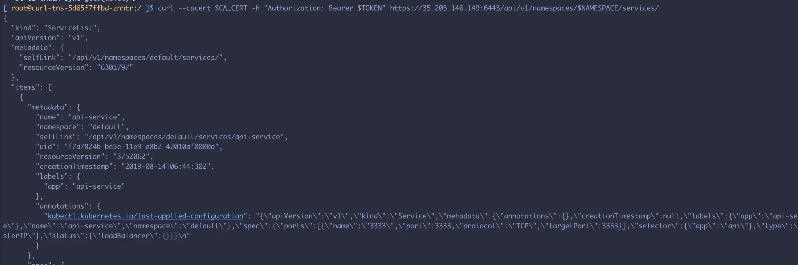 curl --cacert $CA_CERT -H "Authorization: Bearer $TOKEN" "https://35.203.146.149:6443/api/v1/namespaces/$NAMESPACE/services/"