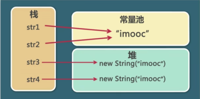 在上述代码String str1="imooc";语句中,会在栈当中生成str1引用,同时在常量池中生成imooc常量,且str1引用指向imooc,同理String str2="imooc";语句,会在栈中生成str2引用,由于常量池中已经有imooc常量,故str2和str1指向同一个imooc。