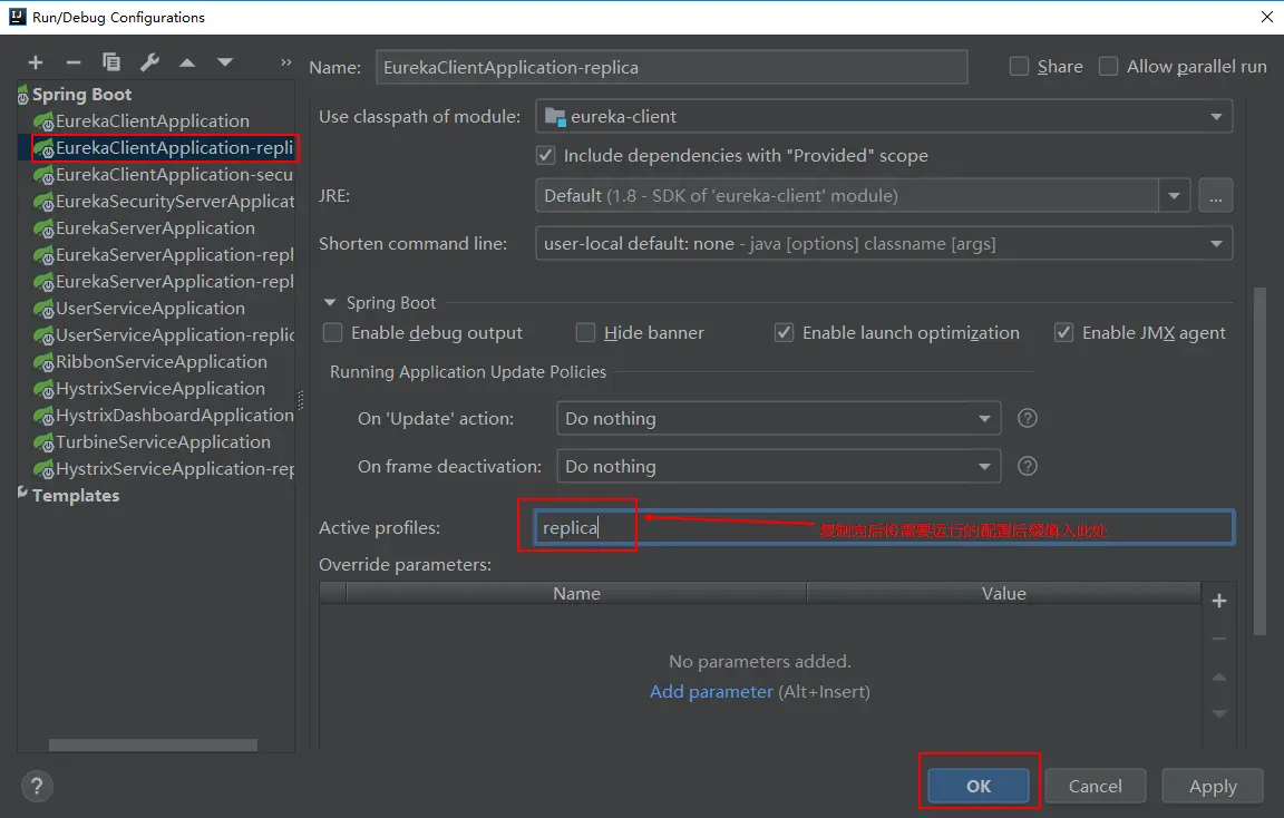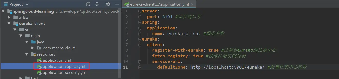 - 此时我们的eureka-client有三个不同的配置,默认配置为application.yml,我们将采用application-replica.yml来启动它;