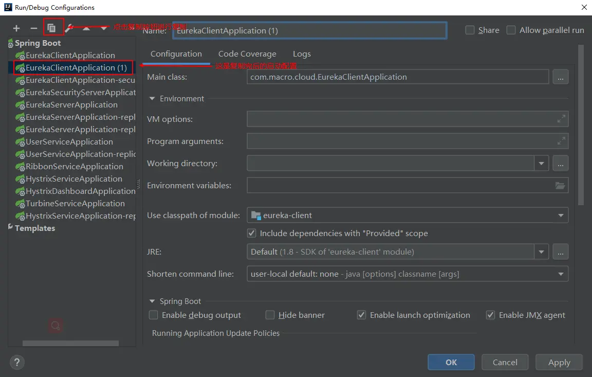 - 首先我们复制eureka-client原来的启动配置: