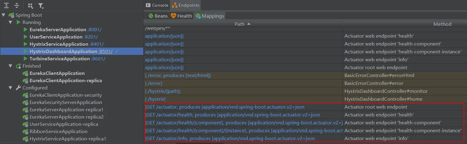 我们可以从IDEA的Run Dashboard中查看到所有暴露的Actuator监控端点,这里以hystrix-dashboard(断路器仪表盘服务)为例。