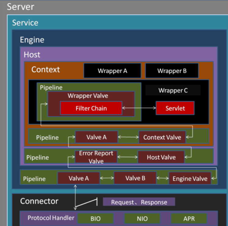 Pipeline上可以有多个Valve,每个Valve都可以做一些操作,无论是Pipeline还是Valve操作的都是Request和Response。而在容器之间Pipeline和Valve则起到了桥梁的作用。