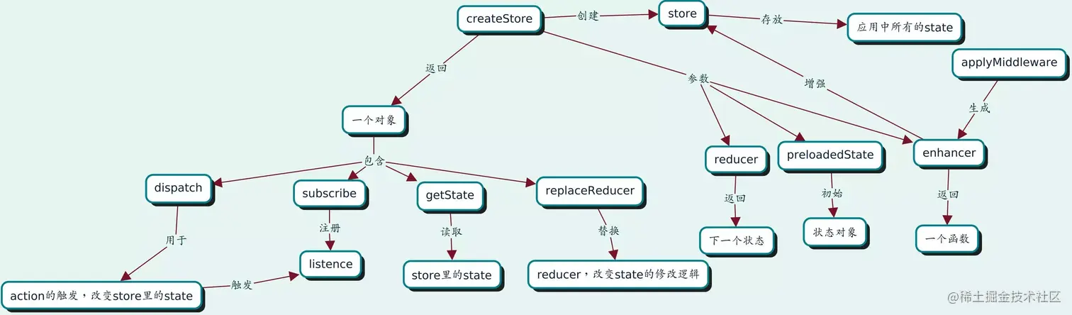 createStore创建一个 Redux store 来以存放应用中所有的 state,应用中应有且仅有一个 store;其中暴露 dispatch, subscribe, getState, replaceReducer 方法。