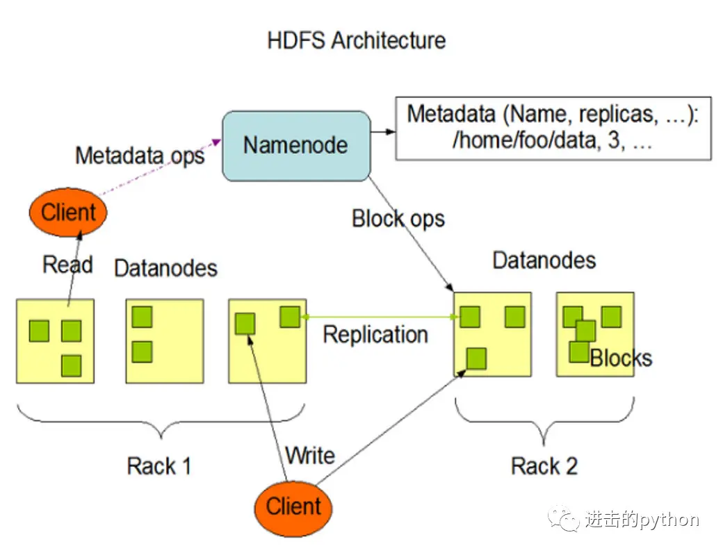HDFS:分布式文件系统,用于存储文件,主要特点在于其分布式,即有很多服务器联合起来实现其功能,集群中的服务器各有各的角色