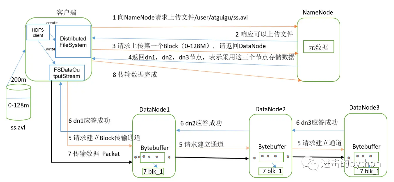 - 客户端通过FSDataOutputStream模块请求dn1上传数据,dn1收到请求会继续调用dn2,然后dn2调用dn3,将这个通信管道建立完成。