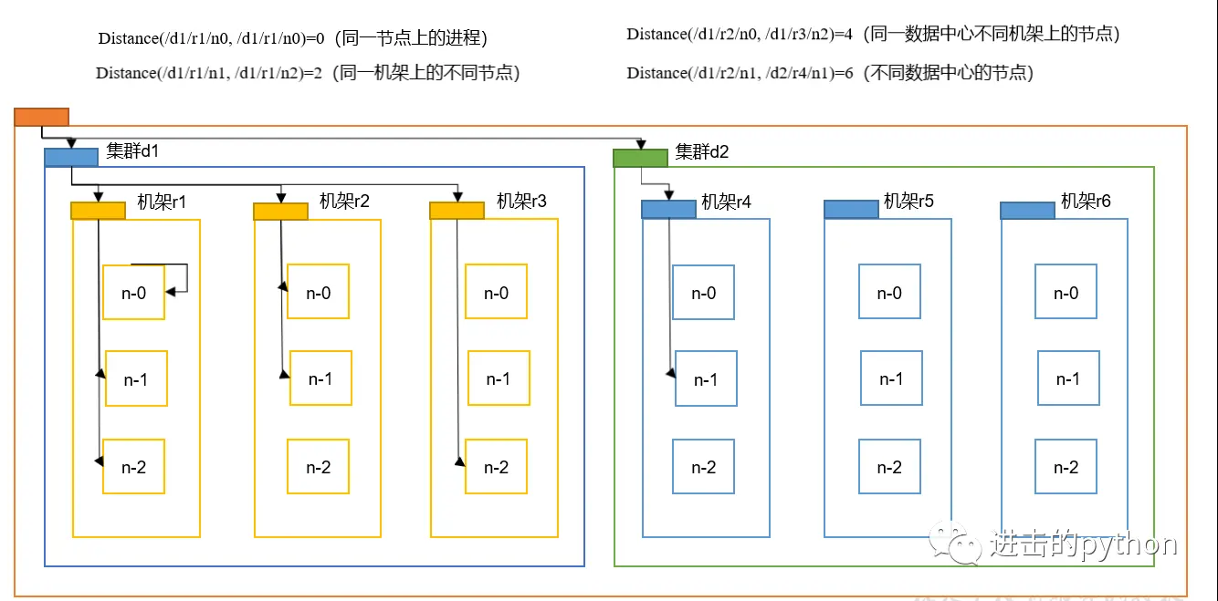 - 不同数据中心的节点距离为两个节点到达共同祖先数据中心的距离之和,为6
