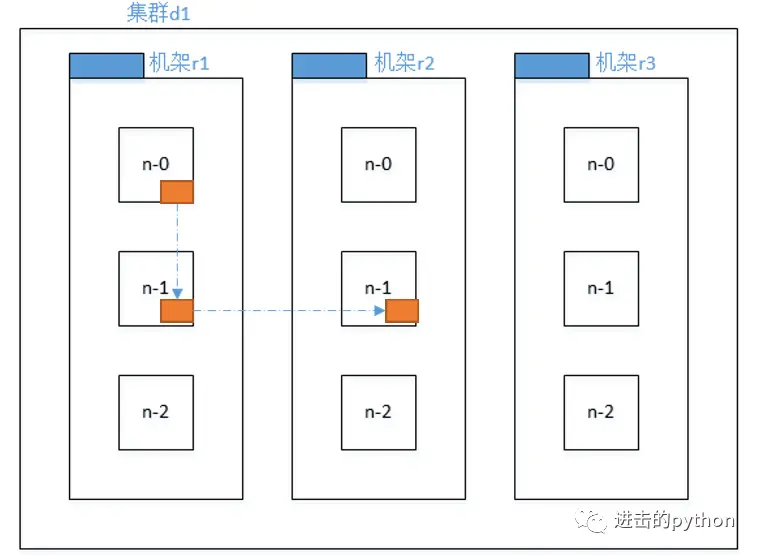 - 同一机架上不同节点的距离为两个节点到共同机架r1的距离总和,为2