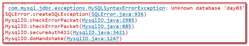异常原因:这个异常是mysql的驱动包爆出来的,对于这个异常我不去解析异常的含义,但是我们只要读取异常后面的错误信息就能明白异常的原因:day03数据库存在。这样类似的unknown database ..都是找不到数据库。