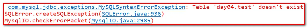 这个异常我同样只看后面的异常信息:表 day04.test不存在。 day04指的是数据库,表名是test。