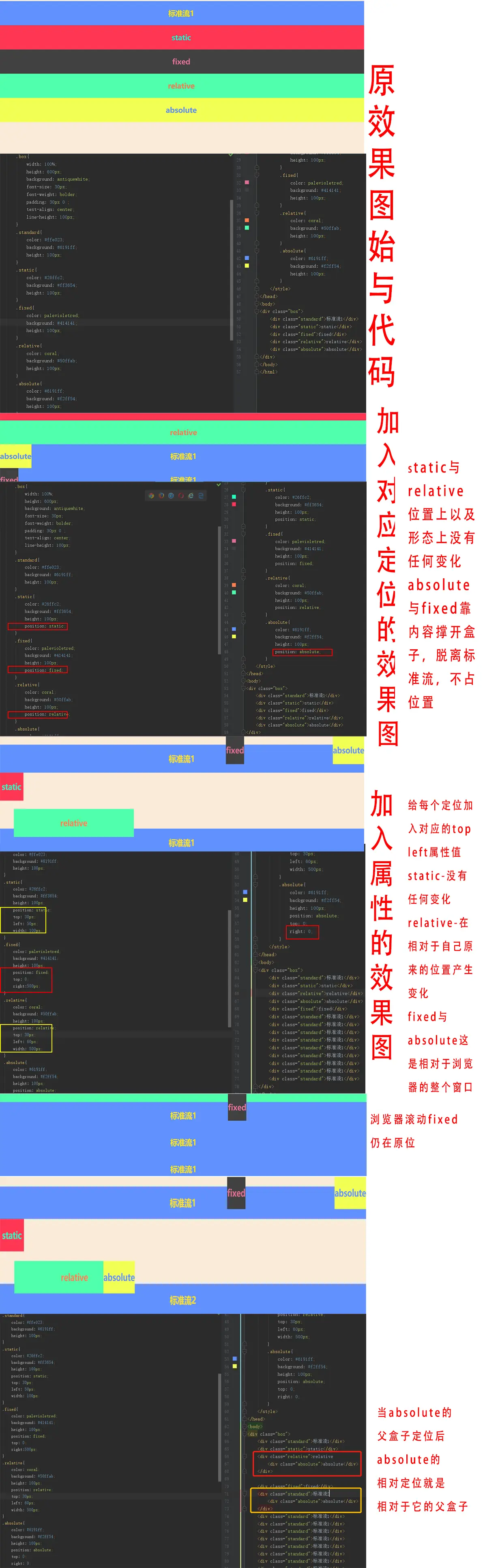 | 相对于谁定位 | —— | 相对于浏览器窗口进行绝对定位 | 相对于该对象在标准文档流中的位置进行偏移 | 相对于static定位以外的第一个父元素进行绝对定位 |