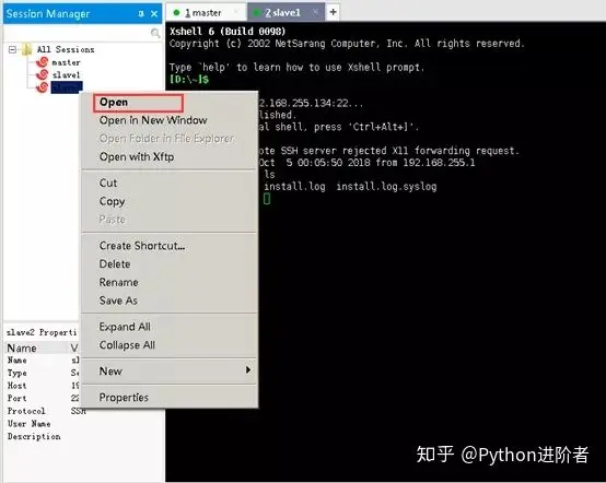 5、选中刚刚创建的会话slave2,然后右键,选中“OPEN”,如下图所示。
