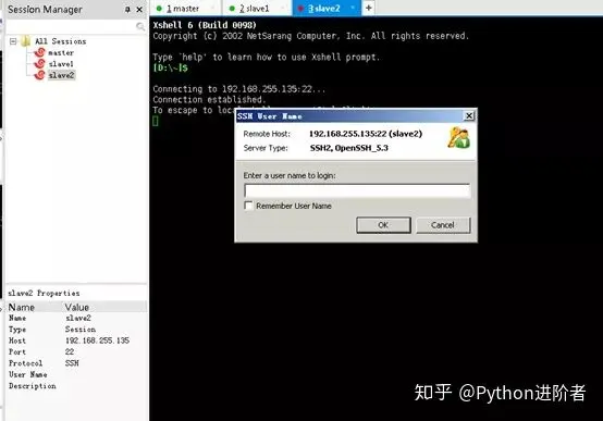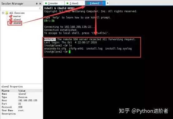 11、上述步骤完成之后,Xshell便会自动去进行连接,如下图所示,远程连接终端slave2成功。