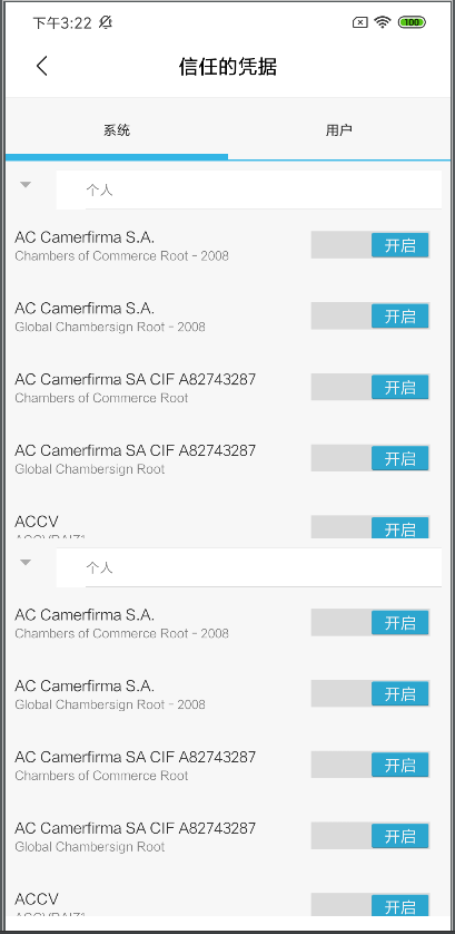 通过详细信息可以看到公钥、公钥参数、证书策略等证书的详细信息 手机作为访问网络的客户端,当然也会有内置证书,以小米手机为例,通过设置-更多设置-系统安全-加密与凭据-信任的凭据来打开内置的CA证书