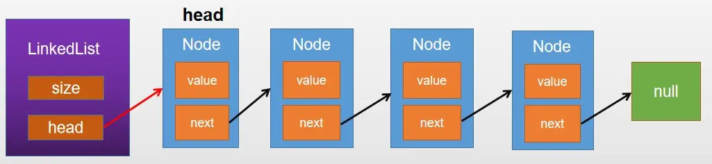 size和head为LinkedList构造函数私有属性,size记录链表中有多少个节点,head指向链表的头结点