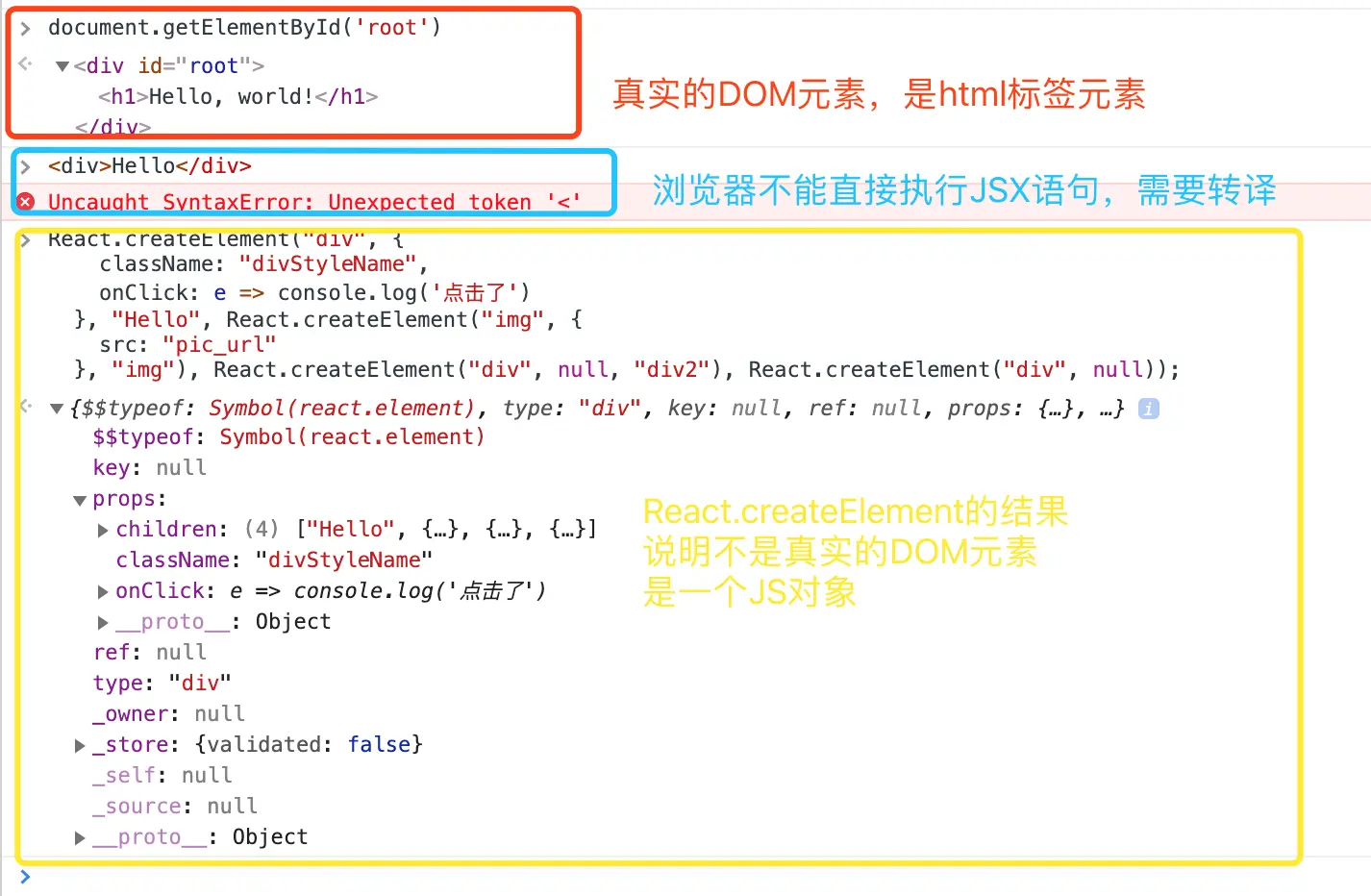 结构正是上面在浏览器窗口中看到的React.createElement的结果的结构。
