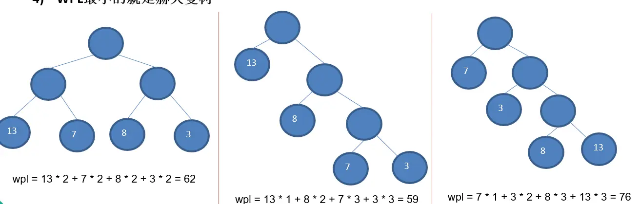 树的带权路径长度:树的带权路径长度规定为所有叶子结点的带权路径长度之和,记为WPL(weighted path length) ,权值越大的结点离根结点越近的二叉树才是最优二叉树。