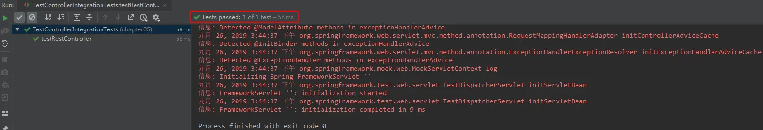 在src/test/java下新建包chapter05,然后在其下面新建测试类TestControllerIntegrationTests如下所示: